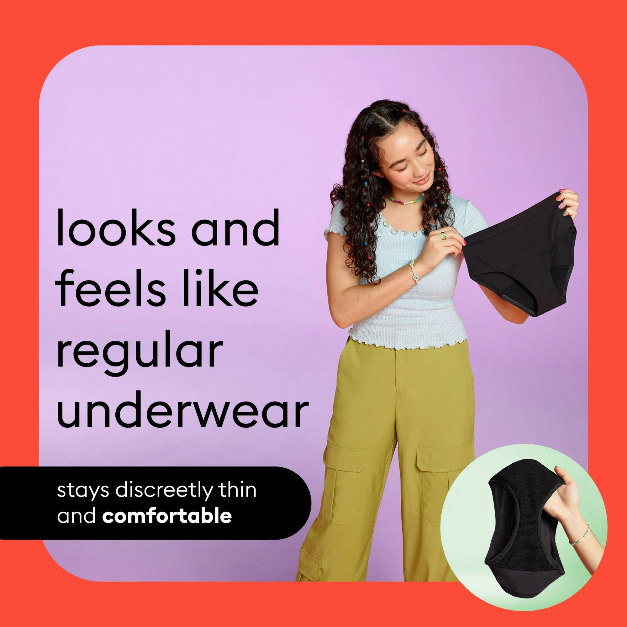From the makers of Thinx, Thinx Teens is period underwear for teens who won’t let their period get in their way. The reusable period underwear looks and feels like regular underwear, but it’s designed with built-in period protection that’s leakproof all day up to 12 hours. The period panties feature an absorbent core layer that absorbs up to 3 regular pads’ worth of flow*, and the moisture-wicking layer helps keep teens fresh and dry. From the period care experts at Thinx, Thinx Teens can be a total replacement for disposable period products, or can be worn as a backup to tampons or menstrual cups. Thinx Teens period underwear are machine-washable and reusable, so teens (and parents) can have peace of mind cycle after cycle. Simply machine wash your Thinx period underwear on cold, line dry, and repeat! Not for use on open cuts, abrasions or incisions. Replace at 30 washes. (*Individual Results May Vary)