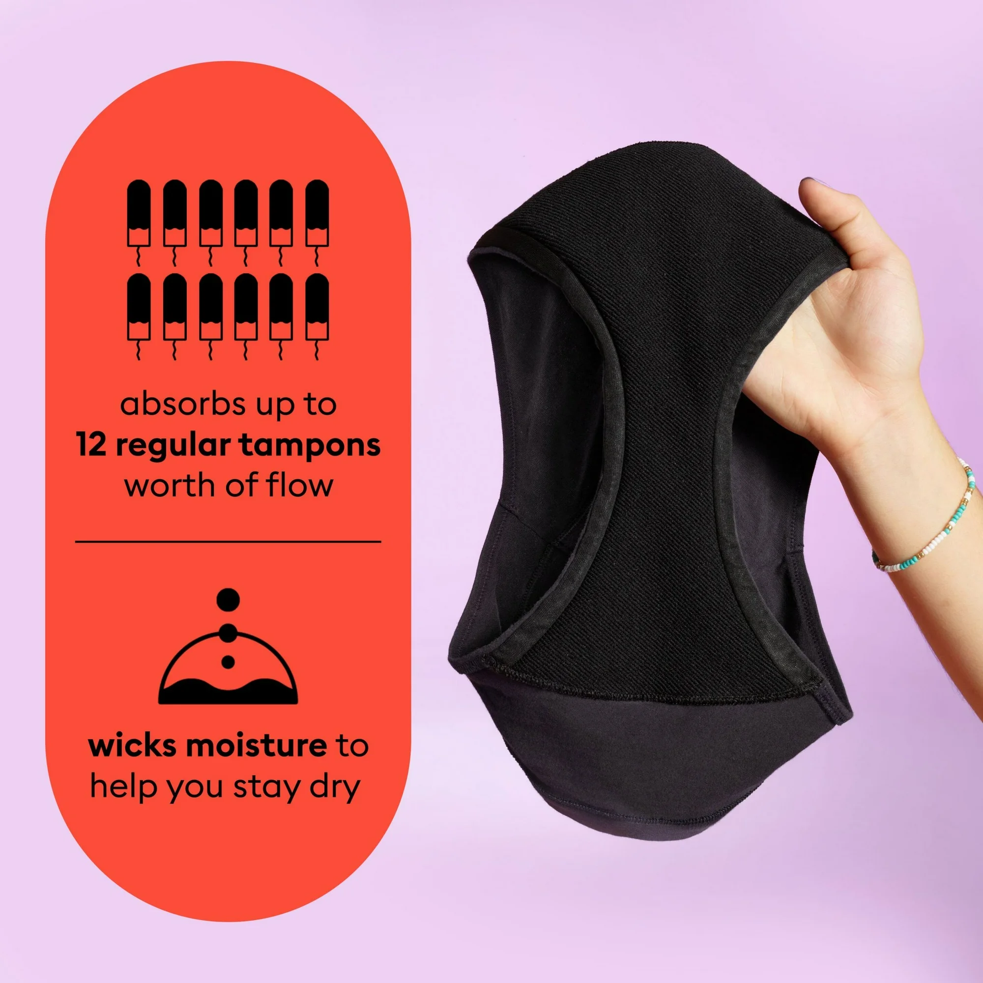 - Can be worn as a total replacement for disposable period products, or can be worn as a backup to tampons or menstrual cups
